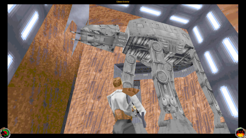 Star Wars: Dark Forces salió en 1995 para Windows y en 1996 para PlayStation. A pesar de ser un clon de Doom, expandió varias de sus mecánicas: en Dark Forces se puede mirar hacia arriba y hacia abajo, agacharse e incluso saltar — cosas que Doom no permitía. Como todos los FPS anteriores a Quake, el juego sigue siendo en 2D.
